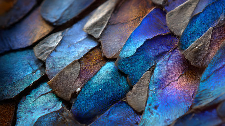 Close-up of iridescent butterfly wing scales. Macro photography showing detailed texture and vibrant colors. Abstract nature pattern.