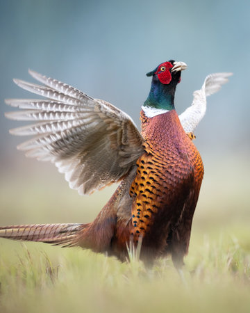 A pheasant rooster (Phasianus colchicus) stands on a dirt road and flaps its wings