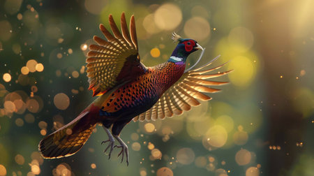 A stunning image of a vibrant pheasant soaring through a golden sunrise over a serene meadow, capturing the beauty of nature and wildlife in motion.
