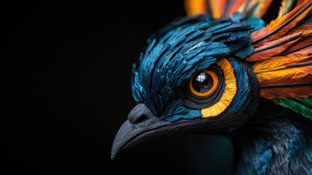 A vibrant portrait showcasing the intricate details of an exotic bird, highlighting its colorful plumage and captivating gaze in stunning detail.