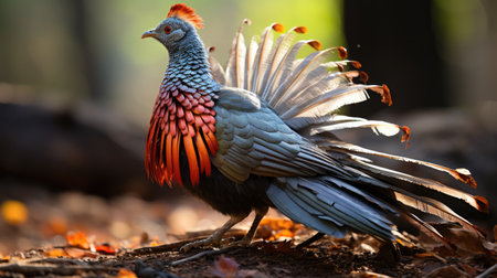 Vibrant pheasant resting in lush forest underbrush captured in impressive detail