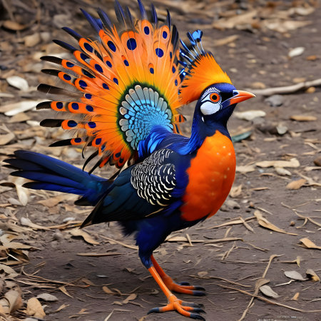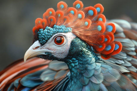 a bird with vibrant, colorful feathers on its head is captured in this photographically detailed portrait. the image showcases the bird's striking dark cyan and orange plumage, while its strong facial expression adds to the surrealistic humor of the scene. this explosive wildlife moment is reminiscent of national geographic photos and showcases the artistic style of zbrush. ai generated
