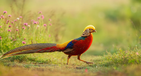 Golden pheasant in vibrant meadow scenery with wildflowers and grasses