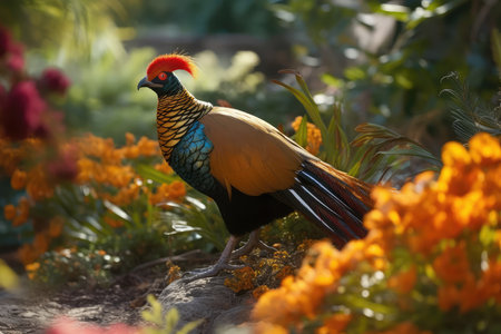 Pheasant in the garden with orange and yellow flowers in the background