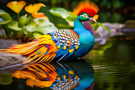 close-up of exotic bird with its feathers in full display, surrounded by lush greenery, created with generative ai
