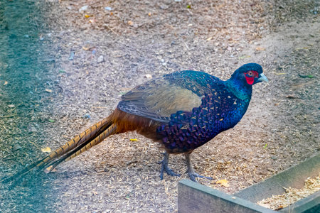 Close-up portrait of an exotic pheasant with vibrant red face and iridescent blue plumage