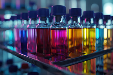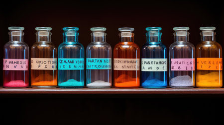 A vibrant display of colorful liquid samples in glass bottles arranged on a table in a laboratory setting, showcasing various scientific experiments and measurements.