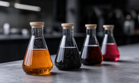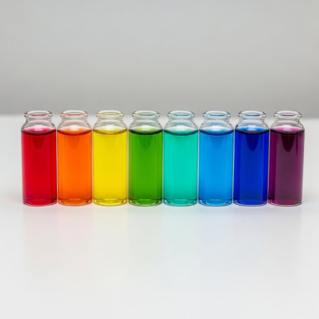 A series of glass vials displaying vibrant liquids in a laboratory setting, showing different colors.