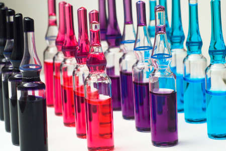 Colourful solutions in different vial with capillary under the light in a chemistry laboratory for healthcare research with a panoramic view