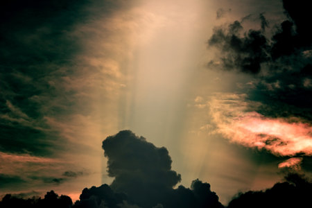 Dramatic sunset sky with clouds and rays of light. Toned.