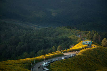 Beautiful Mexican Sunflower on Doi Mae U Ko Hill at Sunset in Winter, Mae Hong Son Province, Thailand.