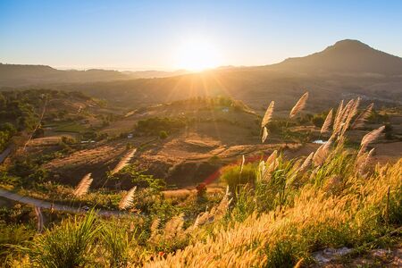 Hill with sunshine in the sunrise at Takhian Ngoa Mountain Phetchabun, Thailand.Natural summer landscape