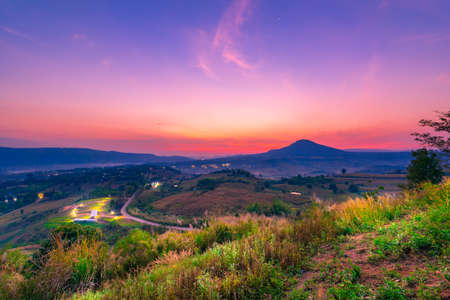High view beautiful nature landscape of colorful sky during the sunset see the lights of the road and city at Phu Thap Berk viewpoint, Phetchabun Province, Thailand,