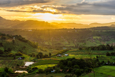 Aerial scenery view of sunrise over mountain range at rural village. Location in Khao Kho District, Phetchabun, Thailand, Southeast Asia.