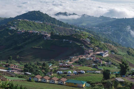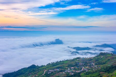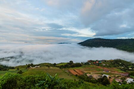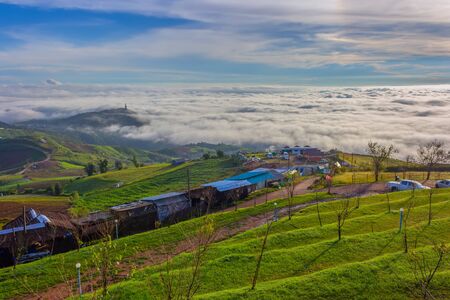 high aerial view sunrise with white fog in early morning at doi Mae salong village Doi Mae Salong, Chiang Rai, Thailand