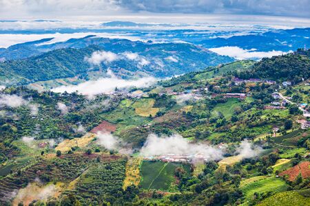 Scenic view of misty mountain in rain season at Doi Pha Hee, Chiang Rai, Thailand.