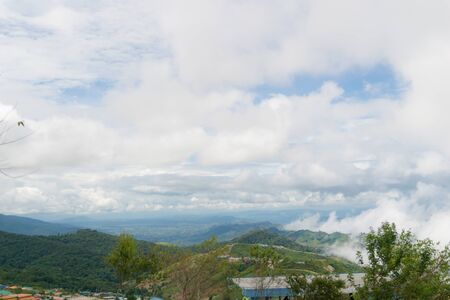 The space for text In the fog and clouds, a panoramic view of the Thai mountains.