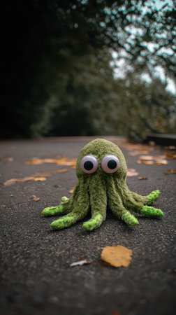 A crocheted green octopus sits on a leaf strewn path surrounded by trees showcasing its large googly eyes and textured tentacles.