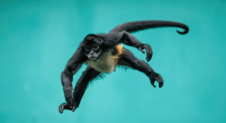 Agile spider monkey leaping against vibrant turquoise background