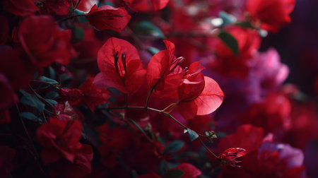 Vibrant red bougainvillea flowers bloom in a lush garden under soft morning light