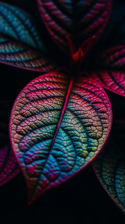 A close-up of a leaf's textured surface a vibrant gradient of deep red, magenta, teal, and yellow, with prominent vein patterns against darkness.