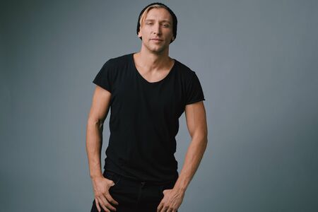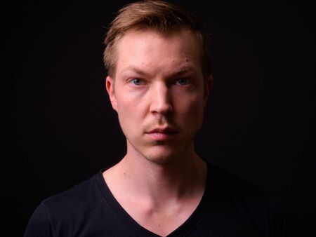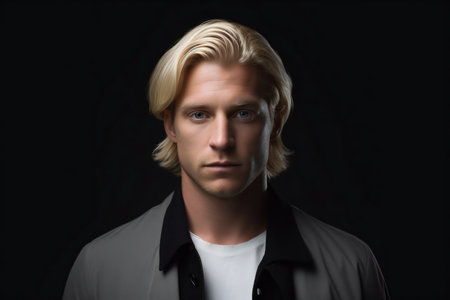 Portrait of a handsome blond man on black background. Men's beauty, fashion.