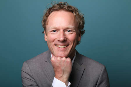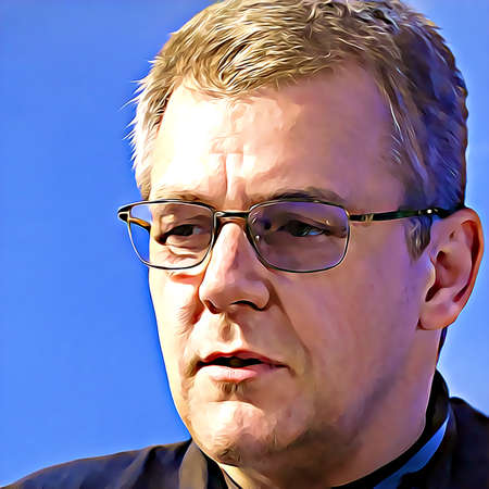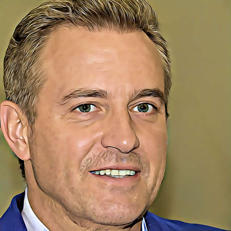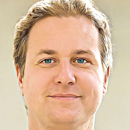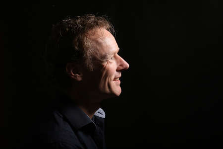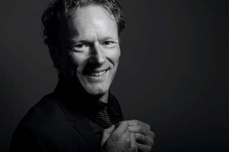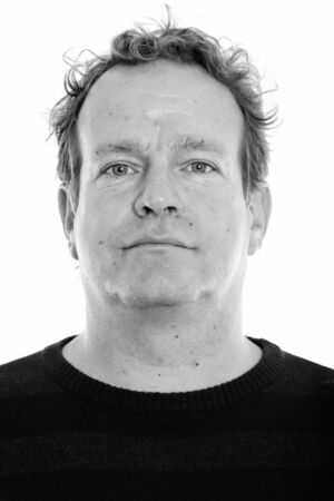 Middle aged tanned blond man with a stubble in a black t-shirt.