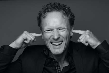 A white middle aged man of European appearance with gray in his hair and a slightly unshaven face in a black turtleneck clutches his head with both hands in despair
