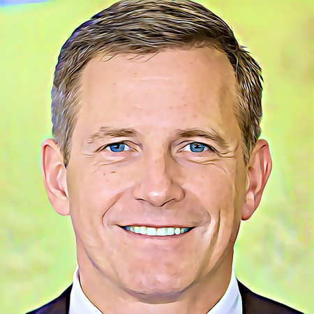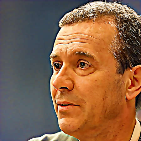 A closeup picture of a middle-aged man, in his 50s, with grey hair and glasses. Blue hazy sky in the background
