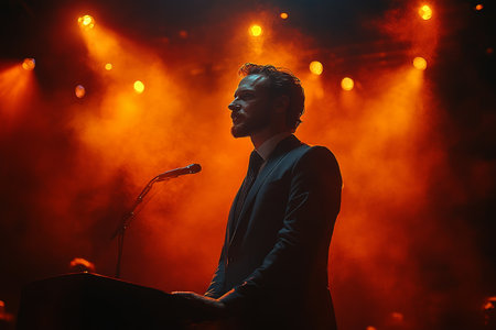 close-up of a man who is ashamed and scared, he has impostor syndrome. strong emotions on the face. Against the backdrop of the auditorium and applause from the audience.