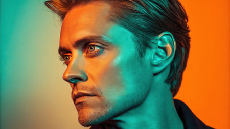 A dynamic portrait where a striking face is enhanced by layered neon orange and teal filters. The colors merge at the edges creating an almost threedimensional effect making the.