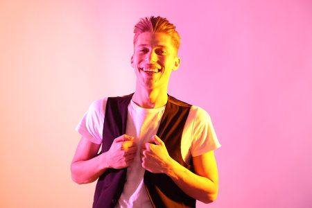 A man in a blue shirt on a yellow background is looking pretty at the camera. Close up. Toned.