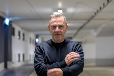Confident middle-aged businessman adjusting his sleeve while standing in a modern underground parking garage, representing professionalism, leadership, business readiness, and corporate confidence.
