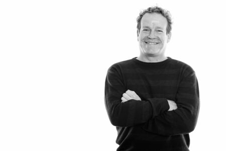 Studio shot of mature happy man smiling with curly hair and arms crossed