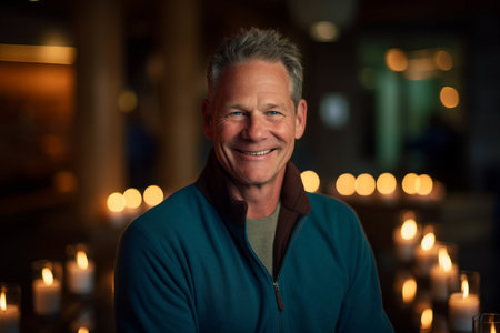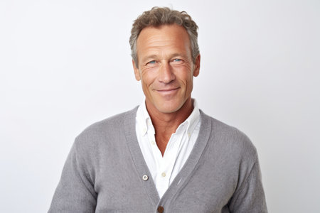 A middle-aged man with silver-streaked hair beams with a genuine smile while wearing a cozy, knitted sweater. He is positioned against a dark background, enhancing his cheerful demeanor.