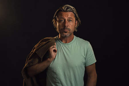 Middle-aged man with a stubble and blond hair in a light green t-shirt holds a brown corduroy jacket over his shoulder.