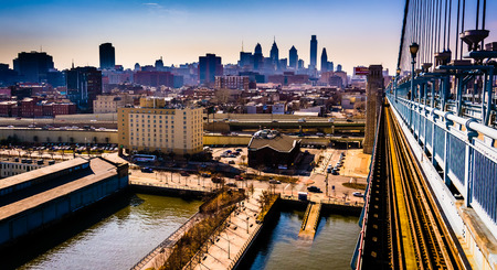 The Delaware River and skyline seen from the Ben Franklin Bridge Walkway, in Philadelphia, Pennsylvania.