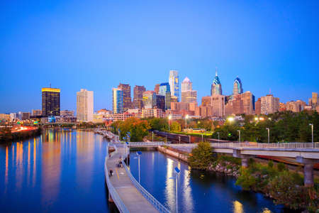 The skyline of Philadelphia with the Schuylkill River at twilight
