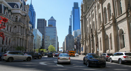 Philadelphia, Pennsylvania, USA - 29 April 2022: Cars moving around the court buildings in center City Philadelphia.