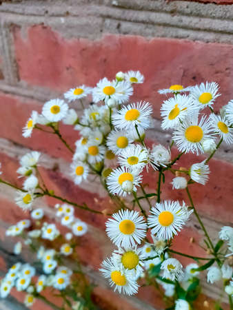 small white daisies on a brown brick wall background.