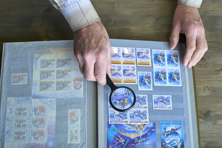 Senior man hands holding magnifier and stamp with postage stamps collection, space theme, wooden background