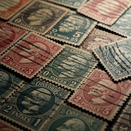 An extreme macro photograph capturing a curated collection of antique postage stamps featuring influ