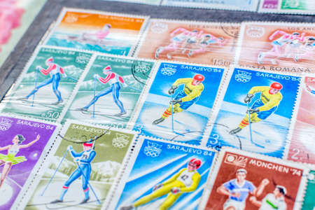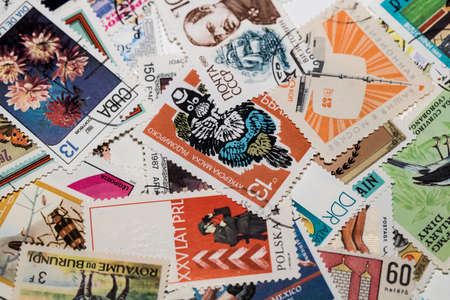 KHARKOV, UKRAINE - JUNE 23, 2020: Background of postage stamps used in different countries of the world shot closeup.