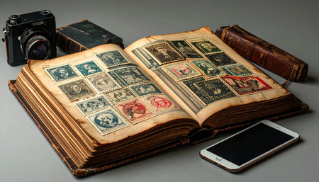 vintage stamps displayed in an organized album, created with generative ai