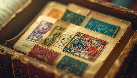 Tucked away in a dusty antique box, a treasured collection of vintage postage stamps awaits discovery.