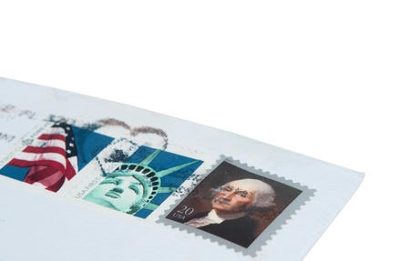 mailing envelope with U.S. stamps on a white background