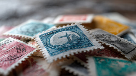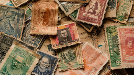 A close-up shot of a collection of vintage postage stamps from various countries. The stamps feature portraits of individuals, intricate designs, and a range of colors and textures. The stamps are arranged in a haphazard fashion, creating a visually appealing collage of historical postage.