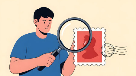 A man in a blue shirt examines a red postage stamp with a magnifying glass. Clear details and vib...