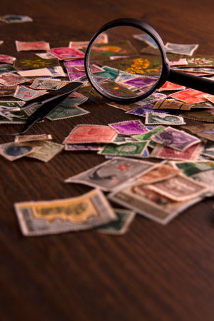 Stamp collection with magnifying glass, shallow depth of field