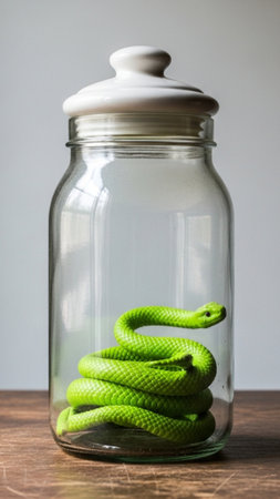 A vivid green snake is coiled elegantly